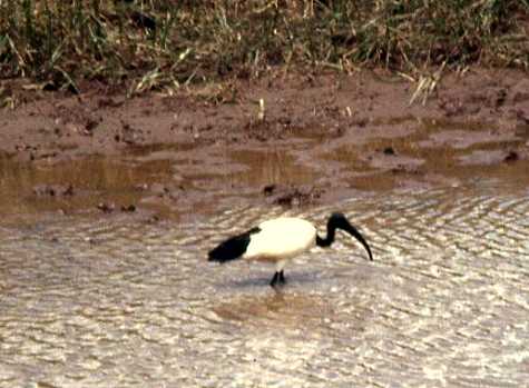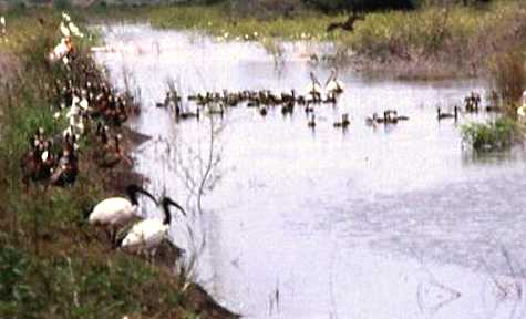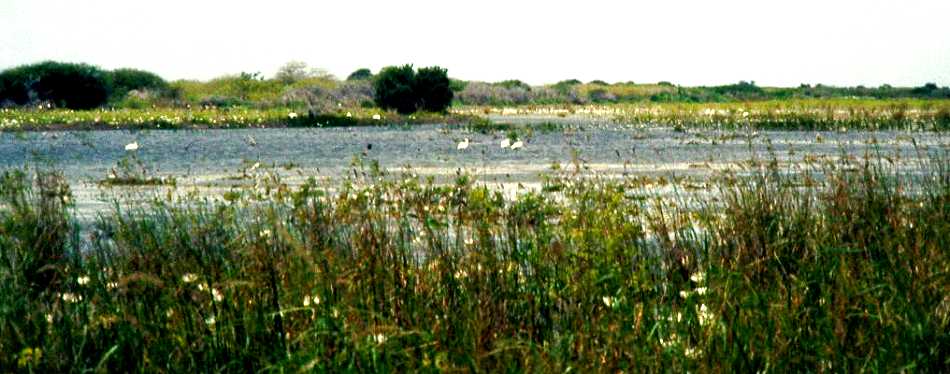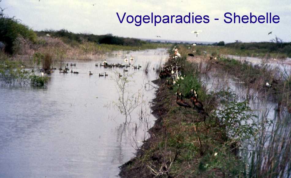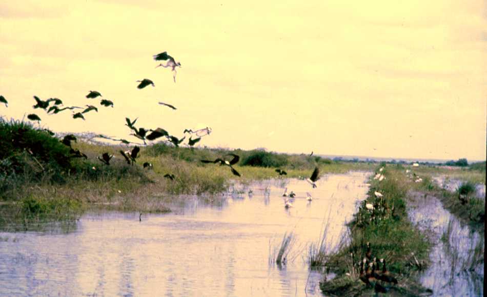 Jeder helle Punkt ist ein Vogel - hunderte an einem Sumpfgelände.