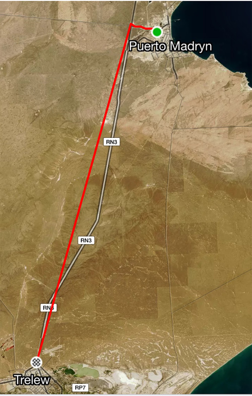 Nach gutem Frühstück im Hotel kam ich kurz nach 8 Uhr auf die Straße. An der nahen Kreuzung Ruta 3 / Ruta 26 die Entscheidung, doch in Richtung Süden zu fahren, also auf der Ruta 3 zu bleiben. Eine schöne, abwechslungsreiche Fahrt, nicht durch den Wind getrübt, die Polizeikontrolle ein Erlebnis, Ausfragen nach dem Woher und Wohin, Extrabegleitung eines Polizisten zum Schalter.