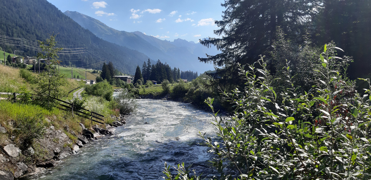 | Ich bin das ganze Tal durchgefahren bis "Stuben", dort gab es allerdings keinen Zeltplatz. Den Arlbergpass wollte ich nicht mehr fahren, da ich mir nicht sicher war, ob die Kapazität der Akkus noch reichen würde. (Es hätte wohl noch gereicht ... und runter kommt man immer! Stuben liegt auf 1400 m Höhe, der Arlbergpass auf 1800 m. Ich bekam noch ein Zimmer in einem Hotel, das Fahrrad konnte im Ski-Keller geladen werden. Bild unten: Blick ins Tal zurück - am nächsten Tag aufgenommen. |